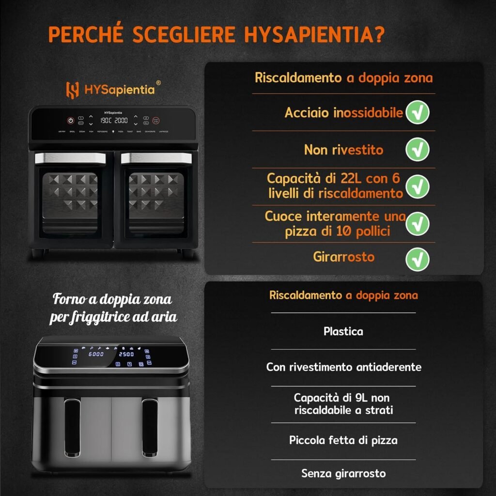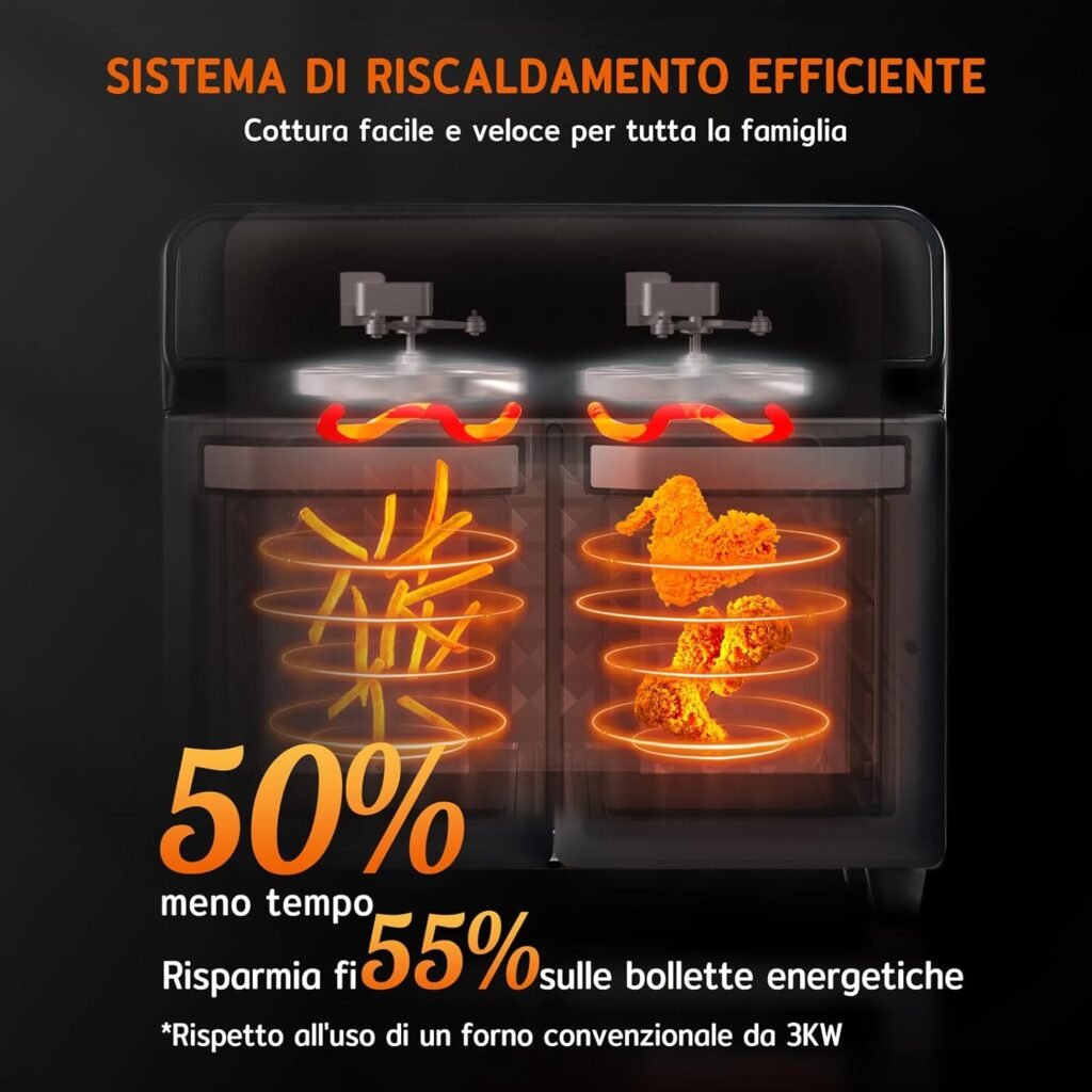 La doppia zona è comodissima: preparo carne e contorno insieme con temperature diverse. Risparmio tempo ogni giorno.